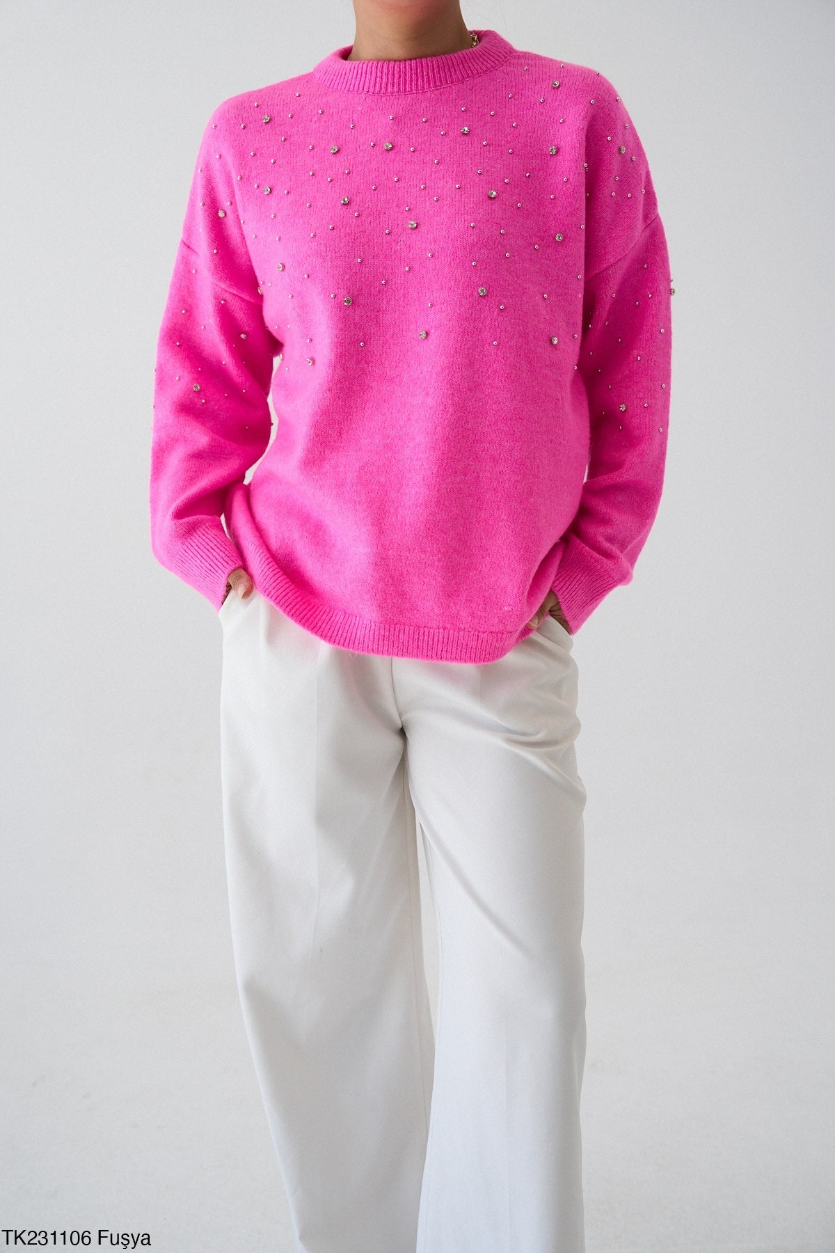 Regular price €29,95Bring instant impact to your winter edit with this soft knit jumper featuring scattered crystal embellishment. The luxe sparkle finish makes it a bestselling style for boutiques wanting statement pieces that photograph beautifully and sell quickly both in-store and online. The relaxed silhouette works perfectly with trousers, skirts and denim, offering a premium look at an incredible wholesale price.