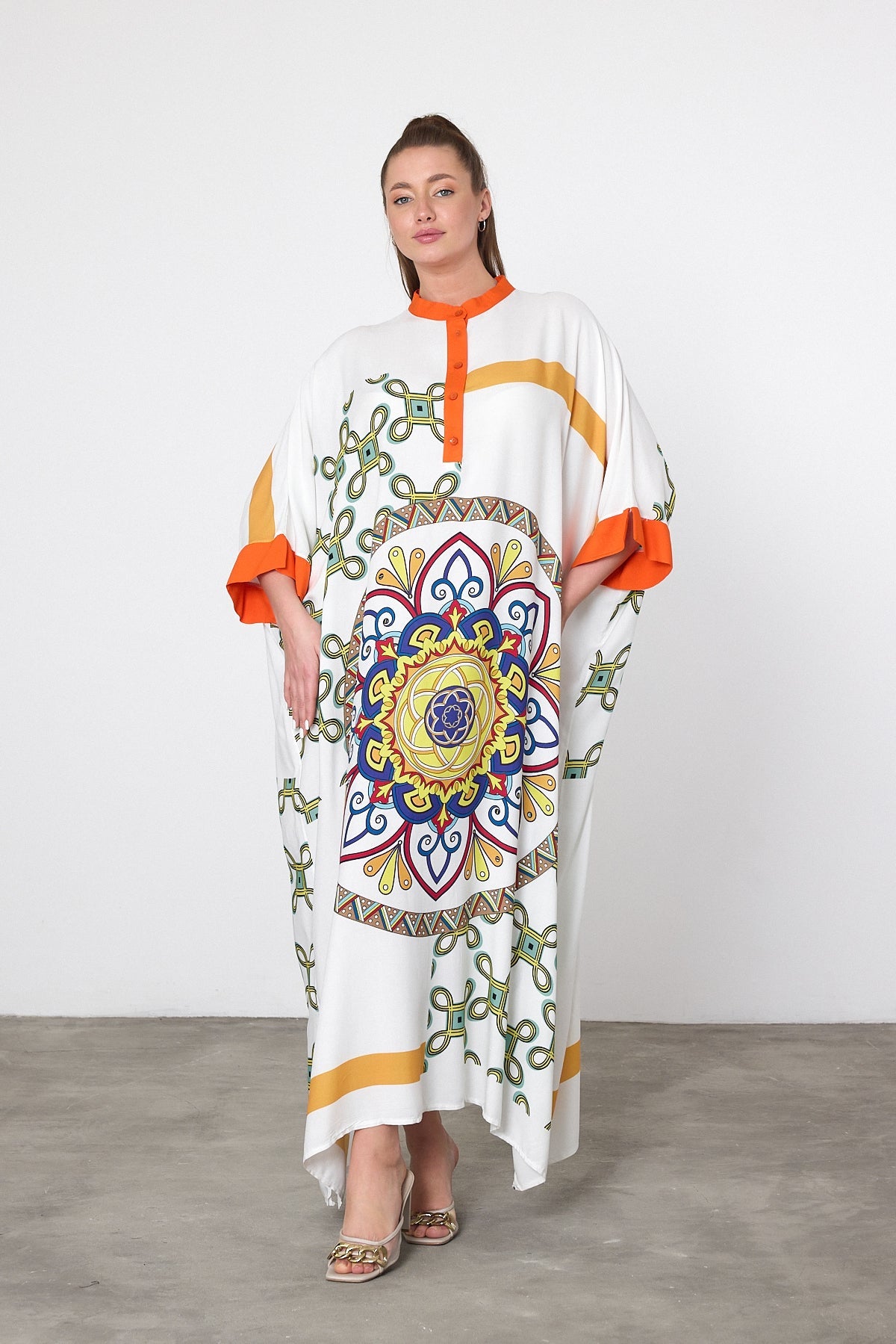 Regular price €100,95A statement oversized kaftan dress designed for effortless summer styling. Featuring a bold central mandala print with contrast detailing, this piece offers a relaxed silhouette with a fluid drape that flatters a wide range of body shapes. The loose fit, wide sleeves, and soft fabric make it perfect for warm-weather dressing, holiday wear, or easy everyday styling.