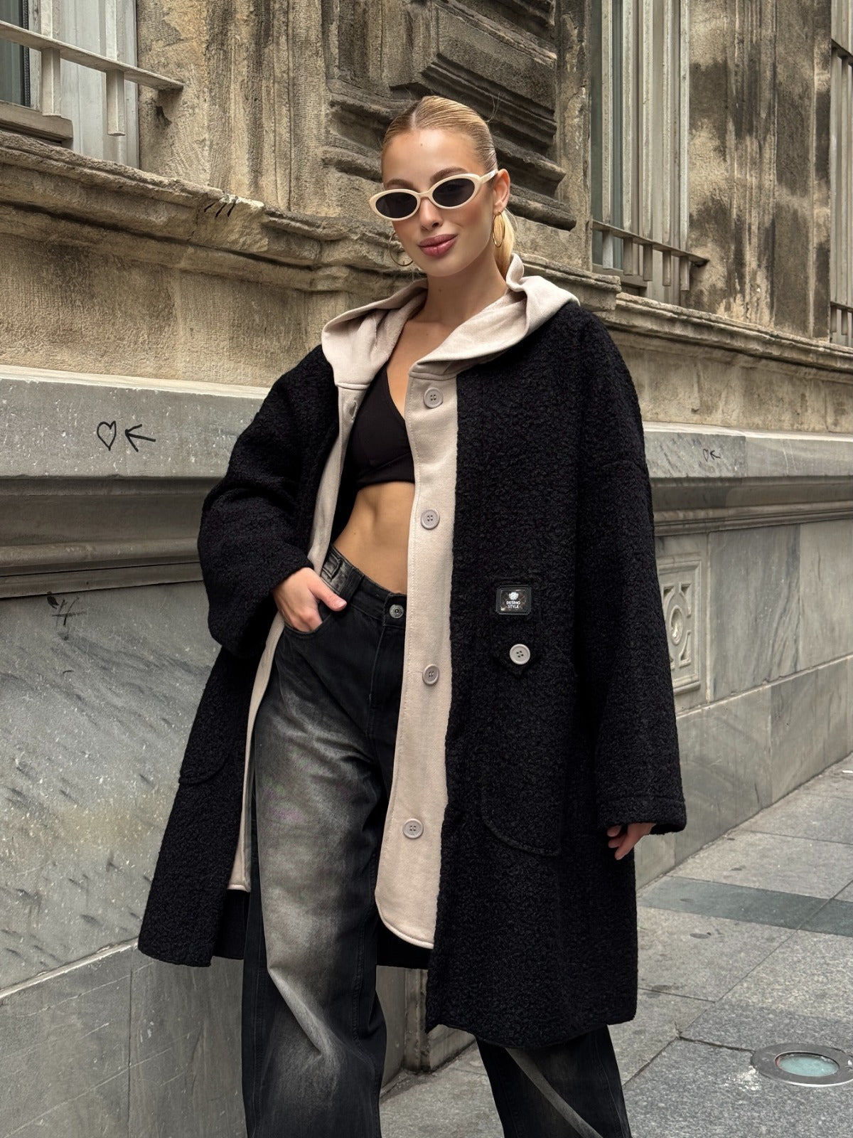 This oversized hooded jacket is designed in a soft teddy-textured fabric that offers both comfort and modern street-style appeal. Featuring large front pockets, button-down closure, and a relaxed fit, it’s a versatile coat you will love for layering over casual or chic outfits.